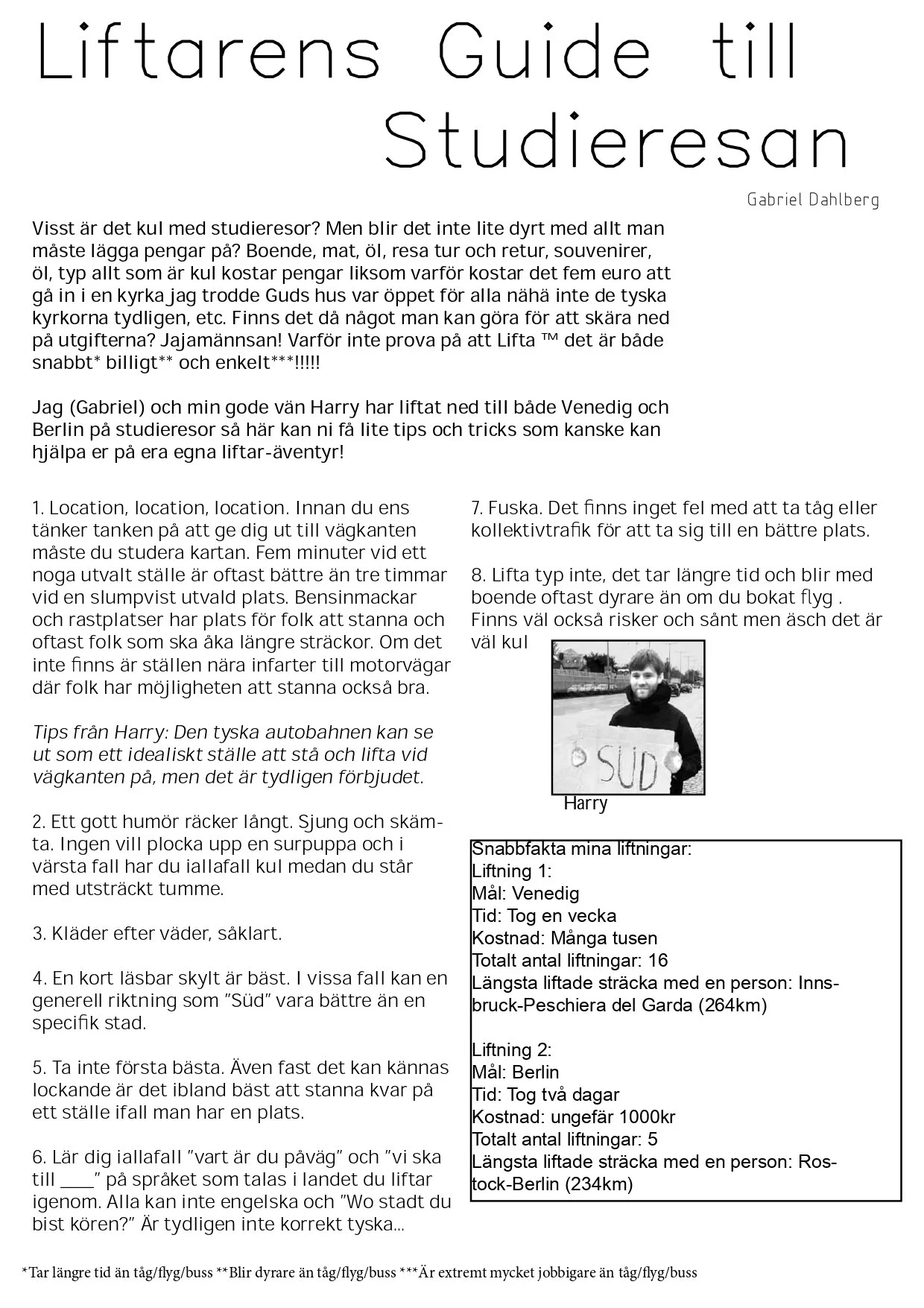Att lifta är ett rätt äventyrligt sätt att färdas på, man får träffa roliga människor och se städer som till och med Gud har glömt. Jag har liftat två gånger i mitt liv. En gång till Venedig och en gång till Berlin. Det var rätt skoj. Här till vänster finns en artikel jag skrev till A4, A-sektionens tidning