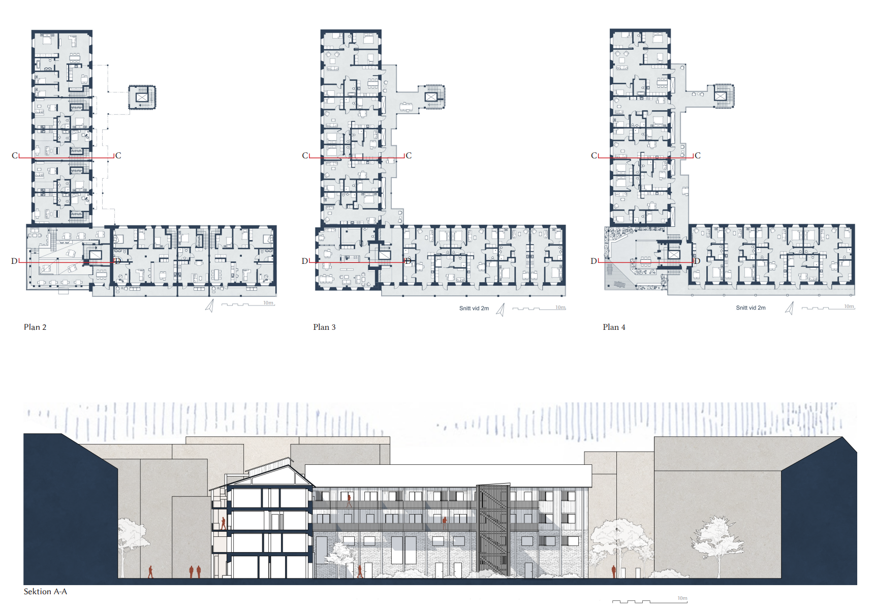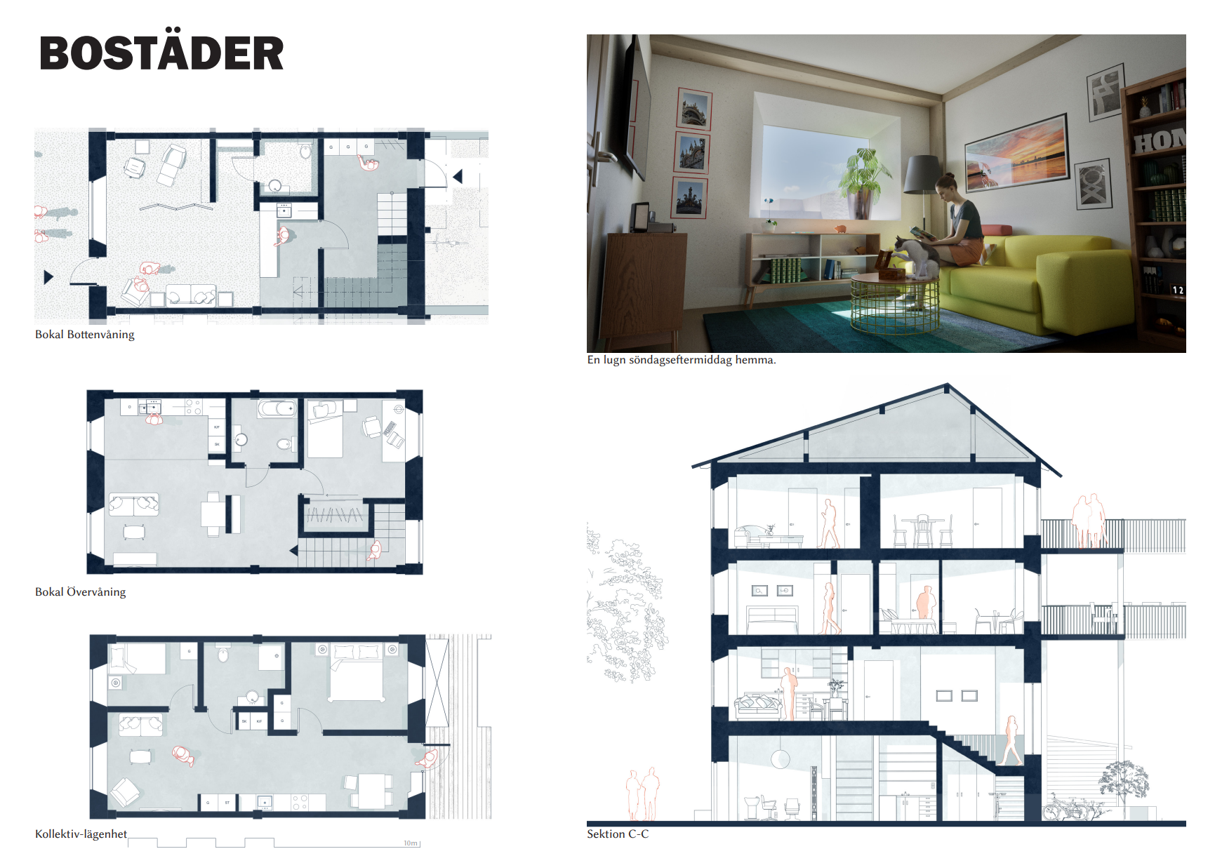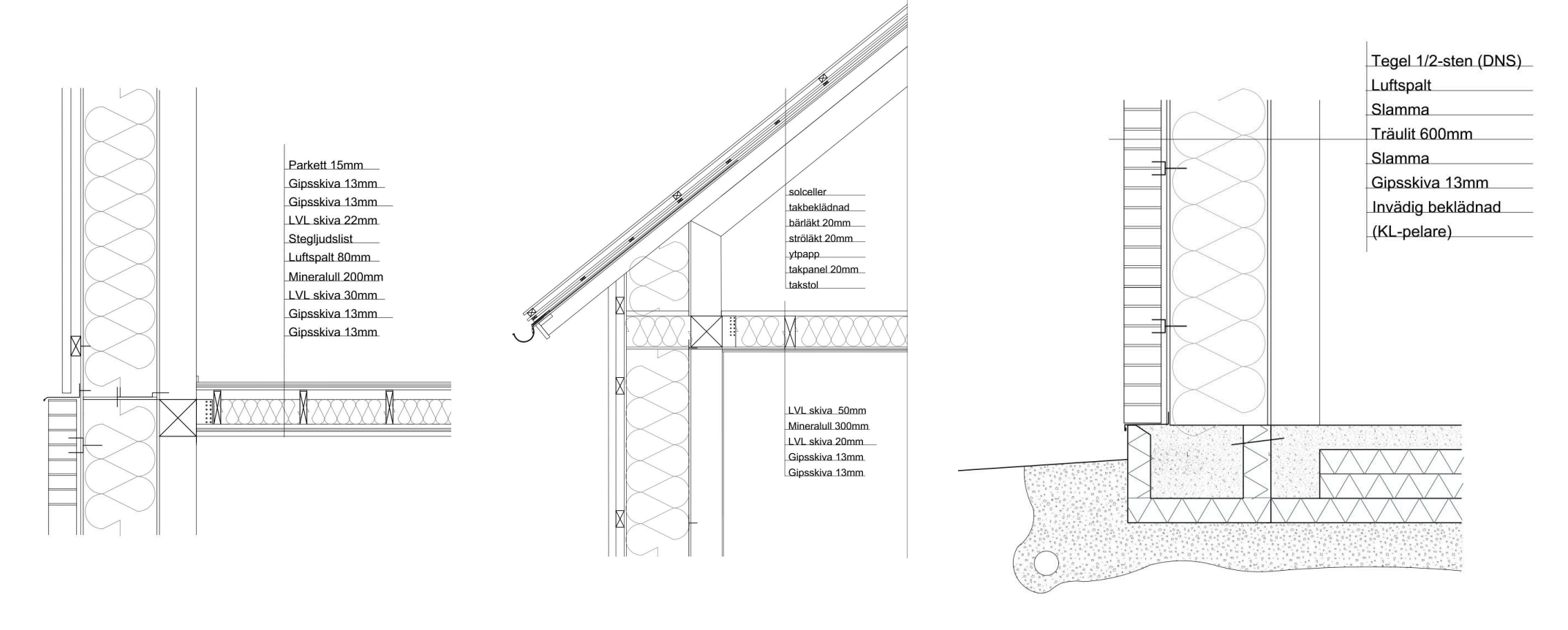 Tekniska ritningar på vägg, tak och grund respektive.