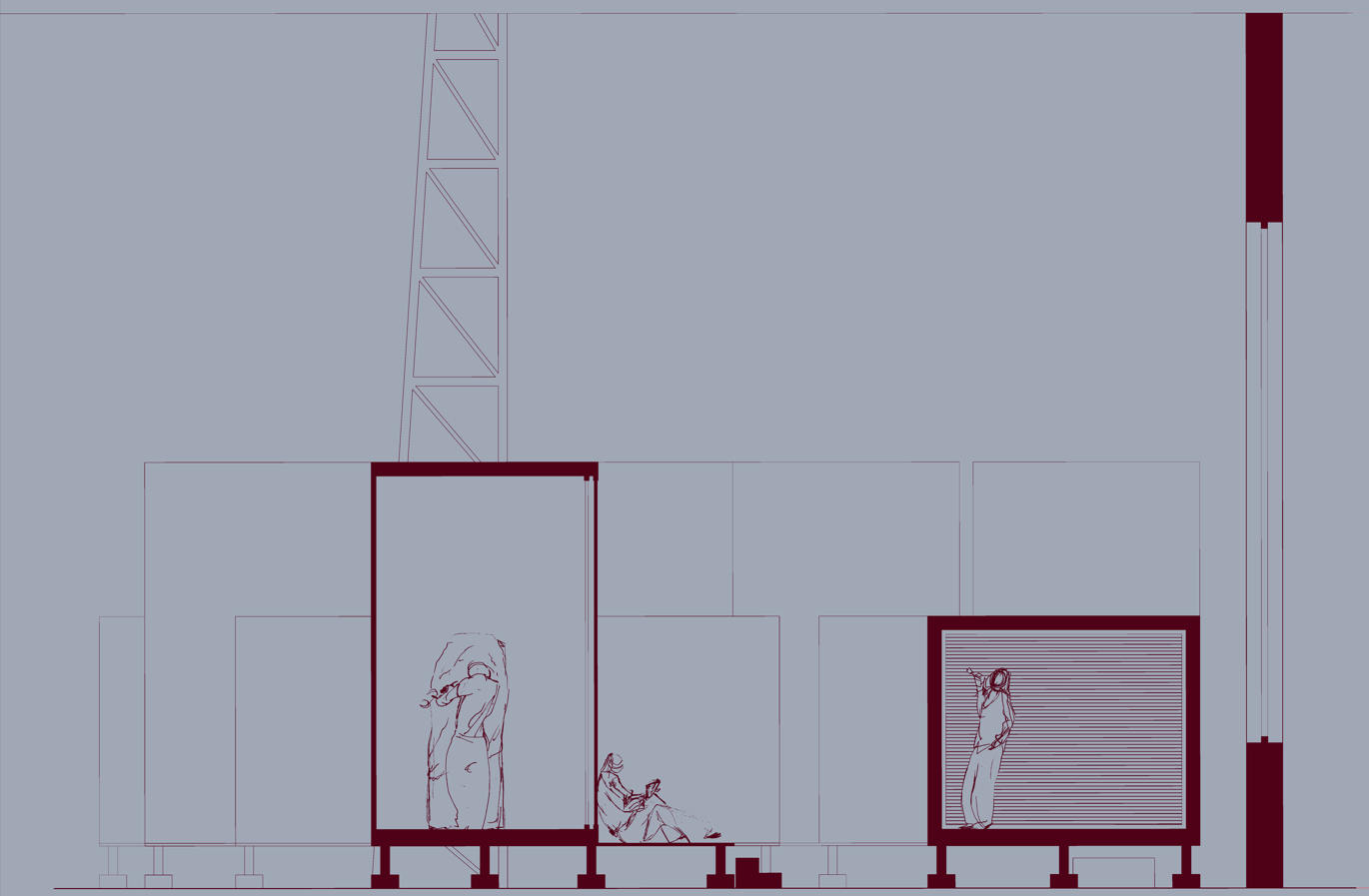 Detta projekt gjordes i början av årskurs två på arkitektskolan i Lund tillsammans med Ida Ahlqvist, Tilda Bertilsson och Hanna Isaksson. Kursuppgiften var att skapa ett offentligt vardagsrum någonstans i västra hamnen, Malmö. Vi valde att skapa ett modulbaserat ateljésystem som skulle kunna sättas upp vart som helst. För det här projektet valde vi att placera dem i ett av kockums gamla gjuterihallar som då stod tomma.